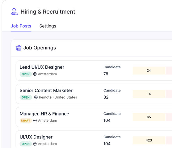 Yosuite Hiring lets you create job posts, manage candidates, customize hiring stages, and track progress—all from one dashboard.